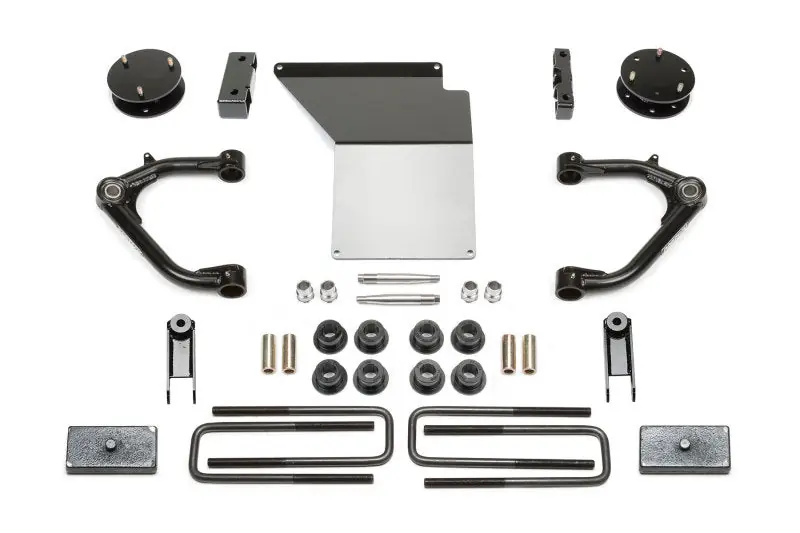 - This system offers a mild lift height with easy installation for clearance of 33″ tall tires on K1500’s w/ factory Magnetic Ride Control suspension.Lift is accomplished by utilizing the factory front Coilover shocks with steel spacer system that helps retain the stock ride of the front suspension. The stock upper control arms are replaced with high quality tubular Uniball arms that allow unrestricted movement throughout the travel range.The arms are constructed of top quality material including .120″ wall 4130 Chromoly tubing with a 1.50″ OD and 1″ FK Stainless PTFE Uniballs. These arms are the best on the market for aggressive offroad driving in harsh conditions.The front differential is relocated to keep CV angles proper with the new lift height while a 1/4″ thick steel skid plate provides protection against offroad obstacles.Rear lift is accomplished with 1 1/2″ rear lift block and u-bolts to help level the stance of the vehicles.- Increased ground clearance. -Top quality Uniball Upper Control Arms for aggressive offroad use. -1″ ID American made FK Uniballs with PTFE for ultimate strength. -Increased fender clearance compared to a Leveling Kit for 33″ tall tires. -Suspension can be restored to stock.