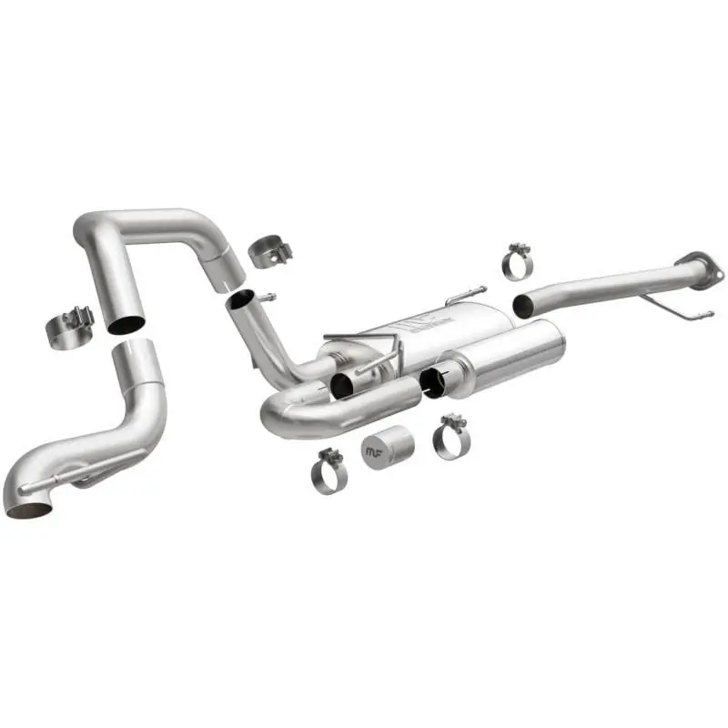 The MagnaFlow Toyota 4Runner Overland Series Cat-Back Performance Exhaust System #19546 will enhance your 4.0L V6 Toyota 4Runner (2003-2024) with MagnaFlow’s renowned deep rumble and dyno-proven performance. MagnaFlow #19546 is weight optimized for additional utility and designed such that its mandrel bent 2.5 in. diameter main piping is situated more closely to the body than the stock configuration. This combined with a single high-clearance no-tip, passenger-side rear exhaust exit allows for significantly improved ground clearance and departure angles. MagnaFlow exhaust system #19546 is compatible with the most popular bolt-on aftermarket modifications and features our No Drone Technology, which cancels out the natural droning frequencies of the V6 Toyota 4Runner at cruising speeds. This allows for a quiet ride on the highway while retaining the character of your rig’s exhaust note. CNC precision robotic manufacturing enables perfect fitment and hassle-free bolt-on installation. The 100% stainless steel construction of exhaust kit #19546 is covered by MagnaFlow’s limited lifetime construction warranty.