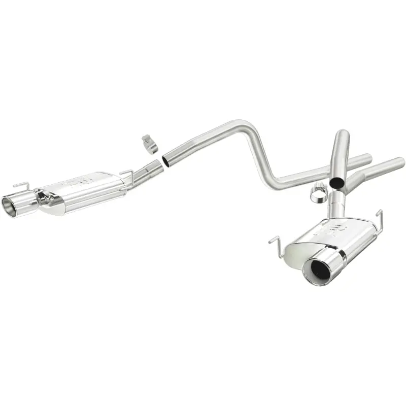 The MagnaFlow 2005-2009 Ford Mustang Street Series Cat-Back Performance Exhaust System 15881 brings out the personality of your 4.6L, 5.4L 2005-2009 Ford Mustang with our signature resonant, powerful engine tone and dyno-proven performance. Thanks to its fast-flowing, mandrel bent 2.5in. main piping and 2 Straight-Through mufflers ending in a Dual Split Rear exit with 4in. Polished Welded-On Double Wall Angle Cut Rolled Edge tips, this Ford Mustang exhaust kit has the performance chops to match its sporty sound and appearance. Upgrade your ride to the next level with an exhaust that has the pipes to put other Ford Mustang’s to shame. With this system your vehicle will be producing Moderate exterior and Mild interior sound levels while leaving other cars and trucks feeling envious at every stoplight. Exhaust kit 15881 features a cat-back layout that replaces your ride’s stock exhaust components from near the catalytic converter on back. Extensive 3D scanning during development has resulted in a direct-fit design that you can easily install yourself. 15881 is produced using CNC precision robotic manufacturing techniques and is backed by MagnaFlow’s 1-year limited finish warranty and limited lifetime construction warranty.