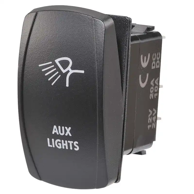12/24V Off/On LED Illuminated Sealed Rocker Switch with “Aux Lights” Symbol (Blue). SPDT, push-fit design with push on terminals, ‘Dash Light’ & ‘On’ illumination Amperage rating 20A at 12V, 10A at 24V Mounting opening: 37.5 x 21mm