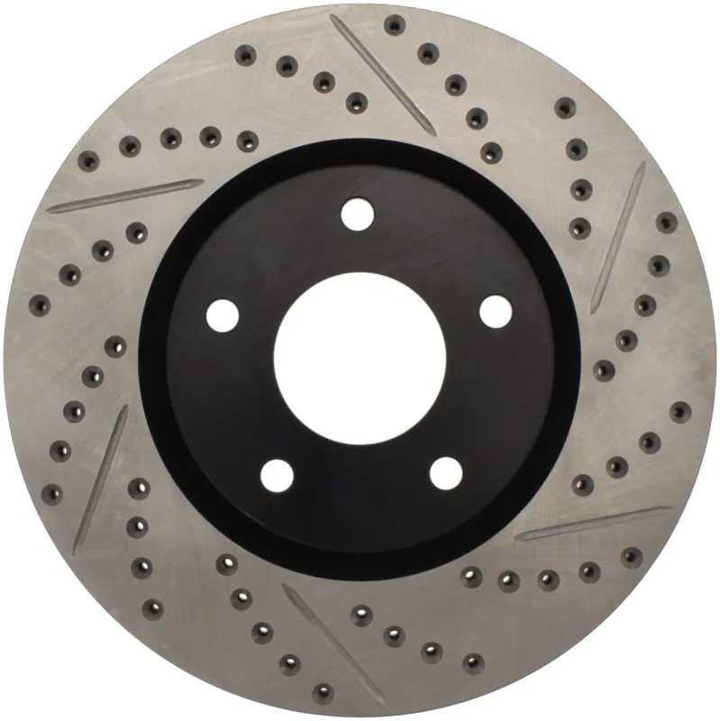 StopTech Drilled and Slotted Sport Rotors are 1-piece direct replacement brake discs for factory brake systems and stock calipers that look great behind your wheels – and offer significantly improved braking performance. The unique cross-drilling and slotting aids with heat and brake dust dispersal; prevents glazing of the pads; adds bite and improves wet and dry braking performance. Built to last; the black e-coating provides protection from corrosion and the high carbon metallurgy (in most applications) offers quieter operation; better crack resistance and increased performance.